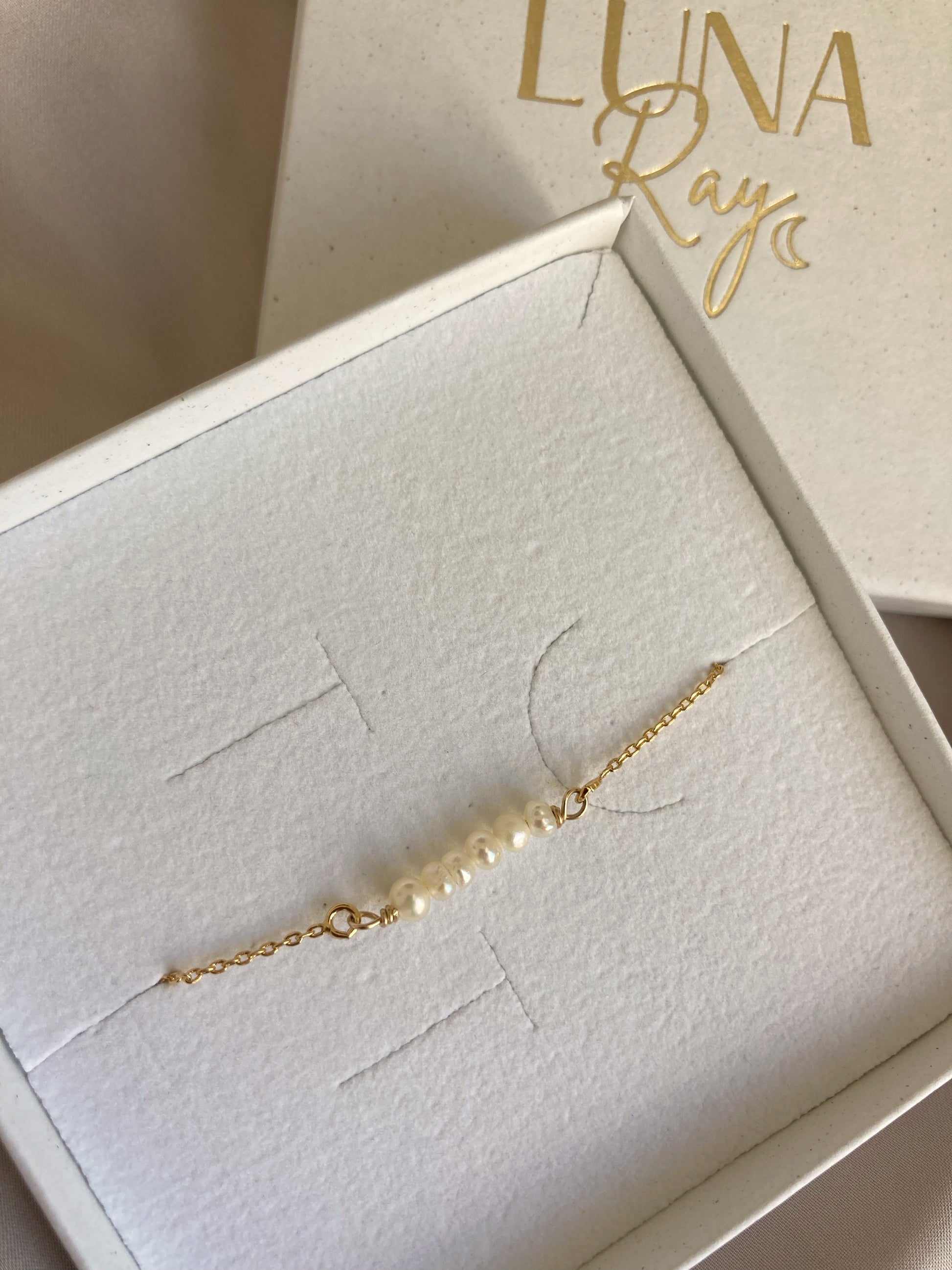 The Dainty Pearl bracelet is handmade with tiny natural freshwater rice pearls & a gold vermeil chain.